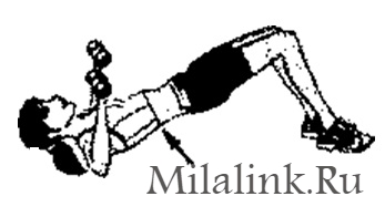 Ляпе на спину. Согните ноги под прямым углом. Возьмите в руки гантели и поднимите их вверх ладонями по направлению к стопам. Приподнимите бёдра так, чтобы тело вместе с ногами образовало прямую линию. Одновременно руки согните и разведите в стороны до уровня плеч.