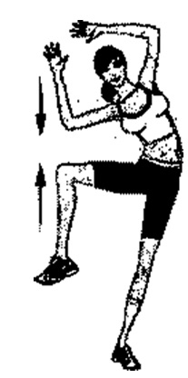 Встаньте прямо. Перенесите вес тела на левую ногу, а правую отведите назад. Руки вытяните вверх - они должны быть примерно на одной линии с правой ногой. Резко поднимите правое бедро так, чтобы оно стало параллельно полу, и одновременно опустите руки ладонями вниз, почти касаясь колена. Повторите 20 раз в хорошем темпе, потом смените сторону.