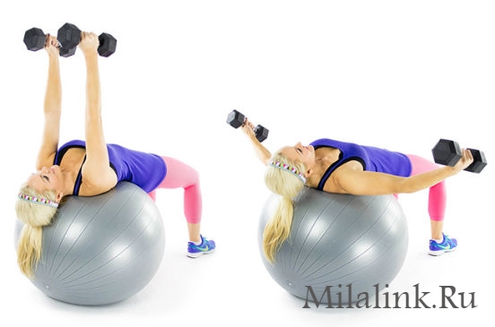 - Лягте спиной на середину мяча, гантели держите в ладонях, обращённых друг к другу
