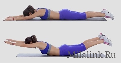 - На выдохе оторвите руки, грудь и ноги от пола и медленно поднимите их максимально вверх. Корпус должен образовывать небольшой прогиб в спине, всё тело напряжено и подтянуто. Старайтесь поднять руки и ноги как можно выше, для этого включайте в работу мышцы живота и ягодиц. Не запрокидывайте шею назад, она должна быть продолжением спины. Задержитесь в этом положении на 4-5 секунд