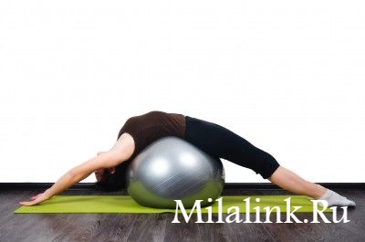 - Лягте на мяч так, чтобы спина находилась на его середине