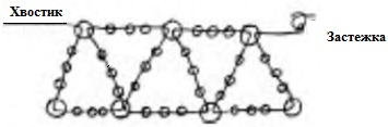 Дальше набираем бисер по следующей схеме: 3 основные бусинки, 1 побочная и 3 основные. Нить продеваем в третью побочную бусинку предыдущего треугольника. Далее работаем по схеме.