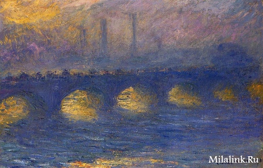 Если выстроить все полотна в один ряд, то мы убедимся, что переезжать жить в Лондон, что бы кто нам ни пел, не стоит торопиться - погода в «зэ кепитал оф грейт британ» не блещет разнообразием: сплошь туманы да морось. Только такой прозорливый художник, как Моне, мог различить мутновато-жёлтые проблески солнца в холодной воде Темзы. Правда, маэстро не бывал в столице Великобритании летом, работа над «мостами» шла осенью 1899-го, в феврале 1900-го и в феврале-апреле 1901 годов. Знаменитый местный туман завораживал Моне. «Пришпилить» его к холсту стало навязчивой идеей художника. Он ещё долго дорабатывал пейзажи по возвращении домой, во Францию. Один из многочисленных вариантов мостов, а именно тот, который мы упомянули выше - «Мост Ватерлоо в пасмурную погоду», датируется 1904 годом. Все остальные «моложе».