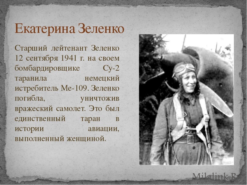 Уйти на фронт - это уже пример бескрайнего мужества, отваги и любви к своей Родине. Что уж говорить, когда этот поступок совершает хрупкая девушка... Она не просто пошла воевать, она смогла подняться в небо и, не уступая опытным лётчикам, вести бой с противником. И лишь ей одной удалось повторить подвиг Николая Гастелло - пойти на таран может лишь лётчик, обладающий не только высоким мастерством, но и силой духа. Имя этой героини - Екатерина Зеленко.