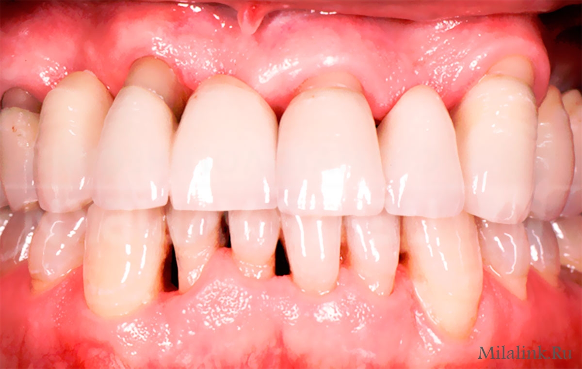 ПРИ ПАРОДОНТОЗЕ воспалительные явления и патологические пародонтальные карманы при данной форме патологии практически отсутствуют. Обычно наблюдаются эрозия эмали и обнажение корня зуба.