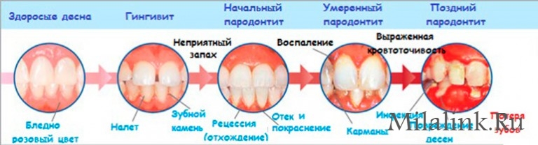 - Некоторые признаки всё же должны насторожить, например: появление кровоточивости как во время чистки зубов, так и при приёме пищи, изменение положения зубов в ряду, оголение корней зубов и «удлинение» зуба, а также боль в дёснах. Кстати, кровоточивость дёсен меньше проявляется у курильщиков, поскольку воздействие никотина на кровеносные сосуды скрывает прогрессирование процесса. По мере нарастания воспалительного процесса кровоточивость дёсен усиливается, появляется неприятный запах изо рта (галитоз), наблюдается явная подвижность зубов, и, в конце концов, всё заканчивается потерей зуба, причём внешне он может быть совершенно здоровым.