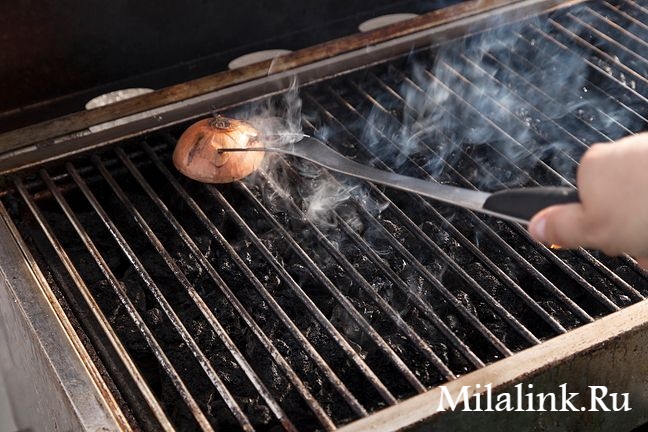 Решётку, на которую будете выкладывать мясо, нужно смазать растительным маслом, прокалить на мангале и натереть луковым соком (половинку луковицы нанизывайте на вилку, чтобы не обжечься). Теперь мясо не будет прилипать к решётке.